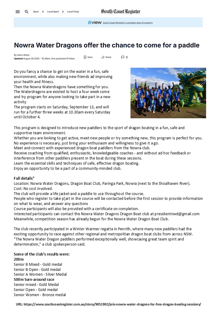 ARTICLE: Nowra Waterdragons offer the chance to come for a paddle, in South Coast Register, 28 August 2025. Read the article online (subscription required) or view a copy here.